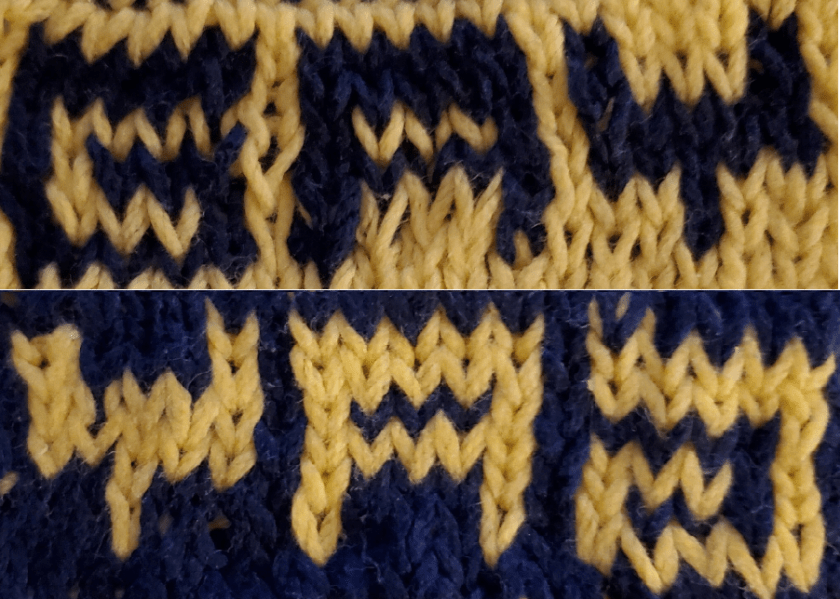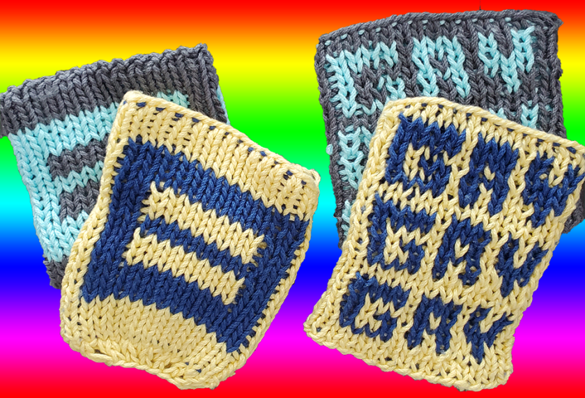 I had learned a technique called Two-pattern Double Knitting from a Craftsy class by Alasdair Post-Quinn and been wanting to use it. Double Knitting creates a double-sided fabric by knitting the first stitch of a pair and purling the second – making a mirror images on the right and wrong sides. But if you knit a word in double knitting, the wrong side will show a reverse image of the word.