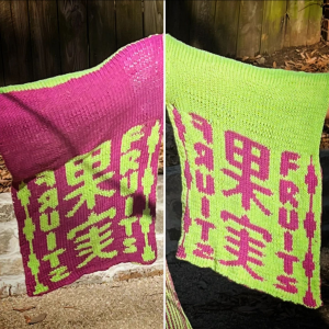 The underarm panels are double-knit reversible motifs of the Japanese and English characters (果実 and FRUITS).