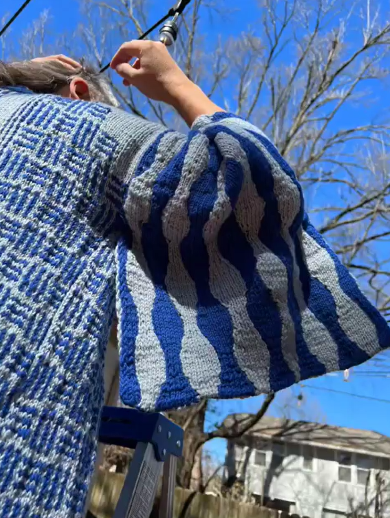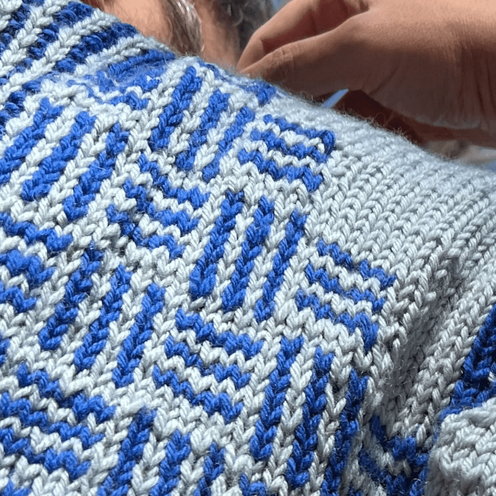 The underarm panels show another traditional Japanese pattern called Tate Waku (立涌), or Rising Steam. The lower part of the panel is double-knitted, and then the front and back side of the panel were separated and knitted individually on the upper part using stranded knitting, making a hole for the arms.