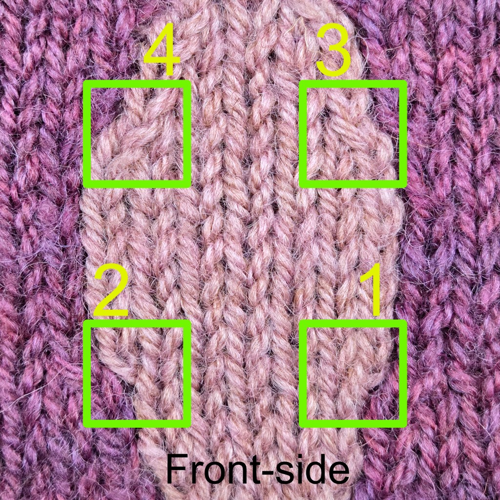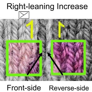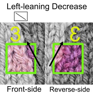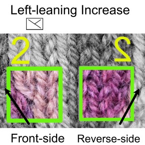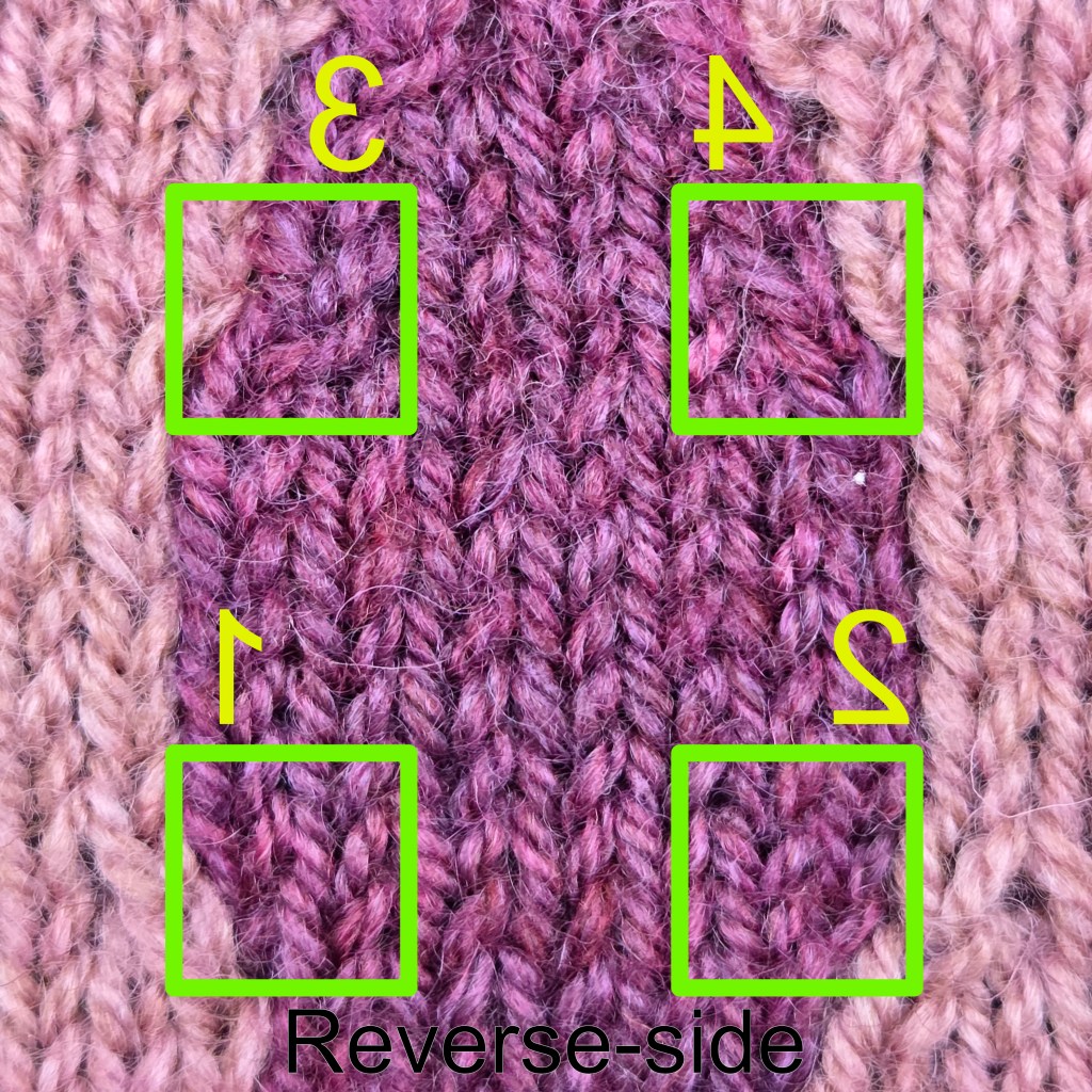 As the images below show, each number corresponds to a double-knit pair of shaping. For example, “1” is a right-leaning increase, but when you flip the fabric to see the mirrored image on the reverse side, it appears left-leaning.